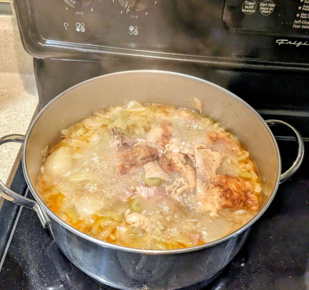 Cover the bones and vegetables with water, ensuring everything is submerged (about 8-10 cups).