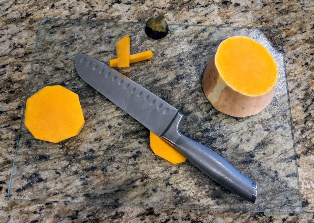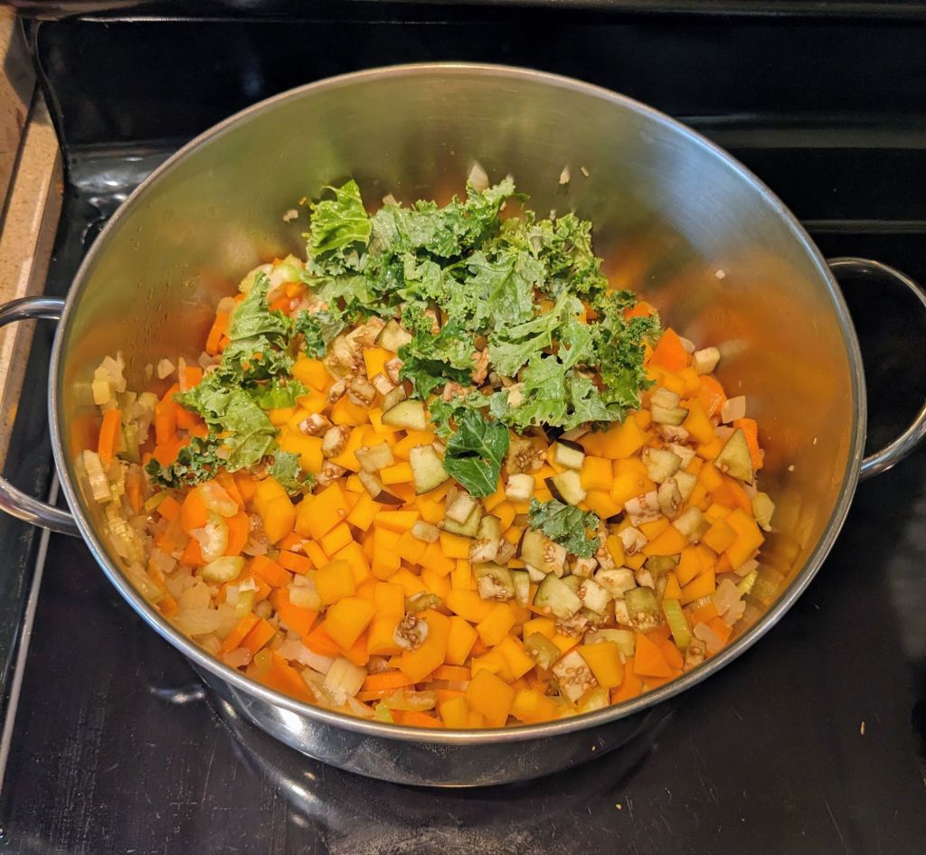 - Cut the veggies to size based on density, the harder the vegetable the smaller you cut it so things cook evenly.