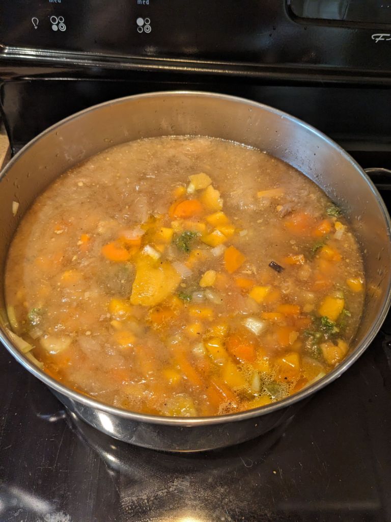 Pour in your homemade chicken bone broth, crank the heat, and bring it all to a rolling boil. Once it’s bubbling, pop the lid on, turn the heat down to low, and let it gently simmer.