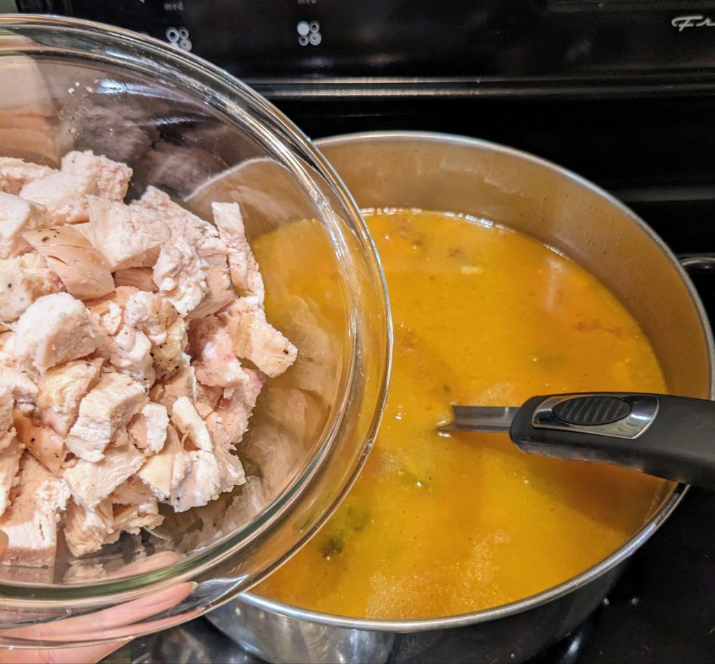 About 5 minutes before you’re ready to serve, stir in your cooked chicken—shredded breast, chopped thighs, whatever you’ve got. Adding it at the end keeps it juicy and tender, not tough or stringy.