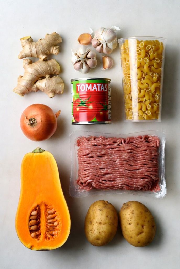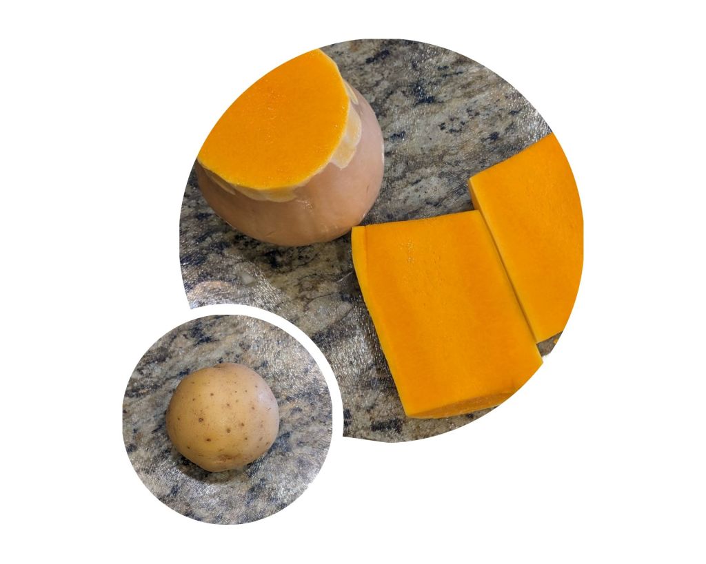 -While the meat is cooking, peel and cube the butternut squash and potatoes into bite-sized pieces.