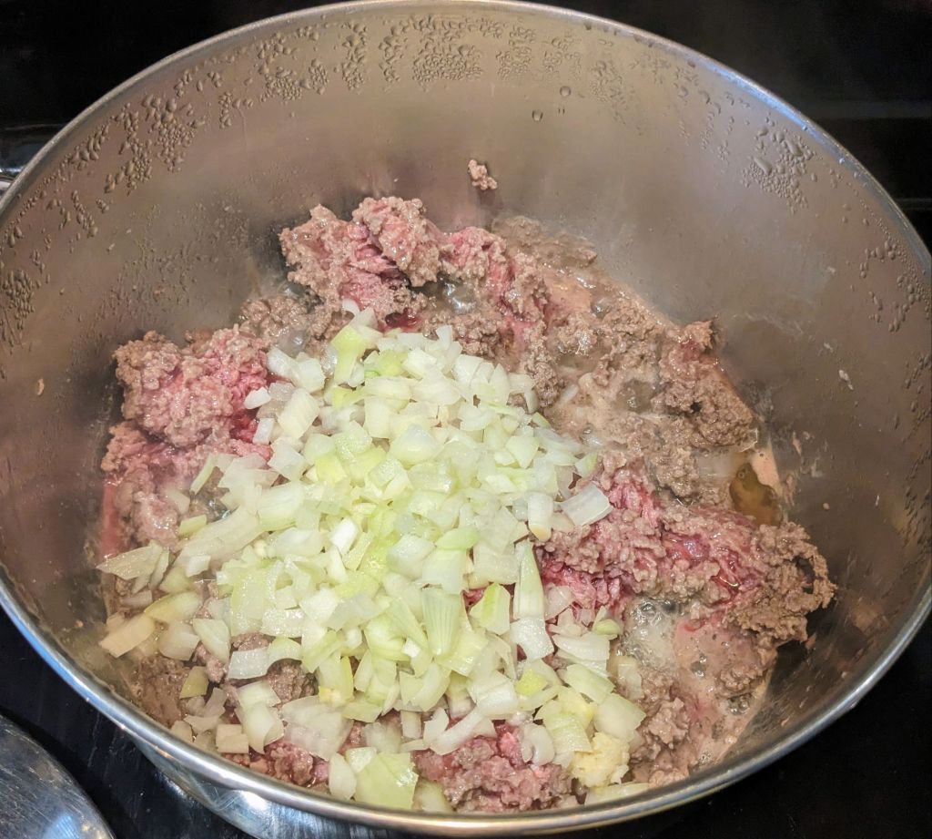-Heat a large pot over medium heat. Add the ground beef—no need for extra oil, it has plenty! Break it up and let it cook slowly for a few minutes until it’s browned.