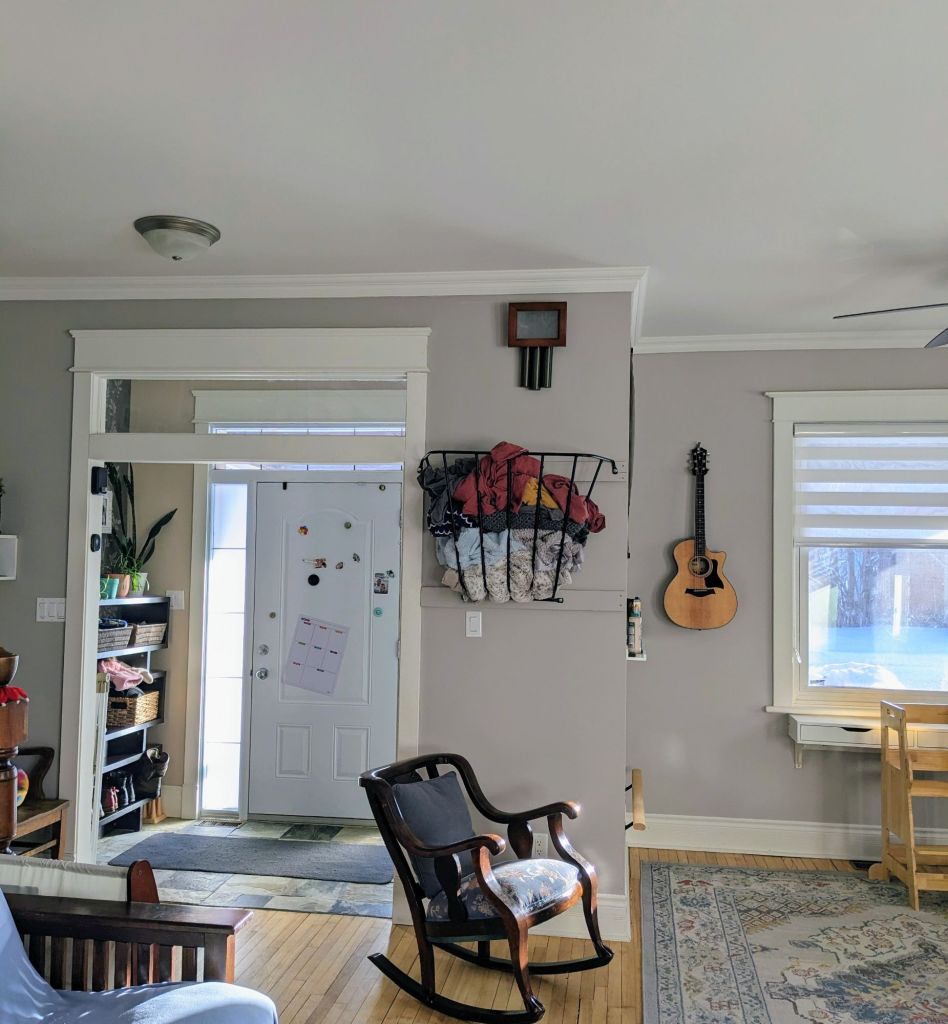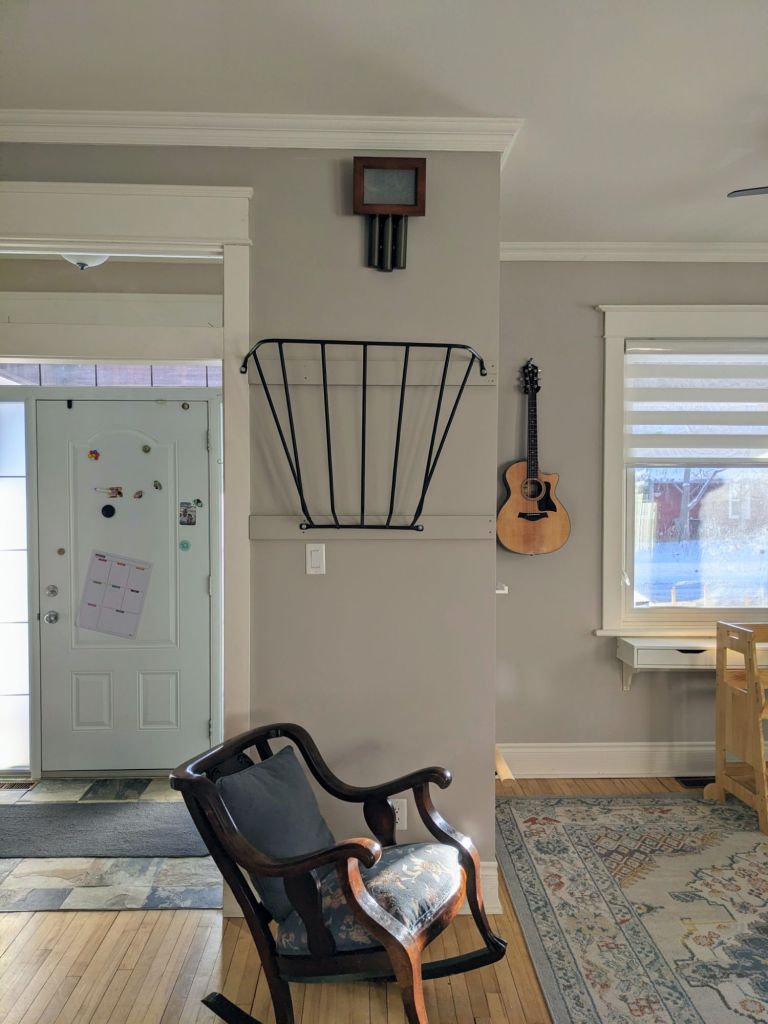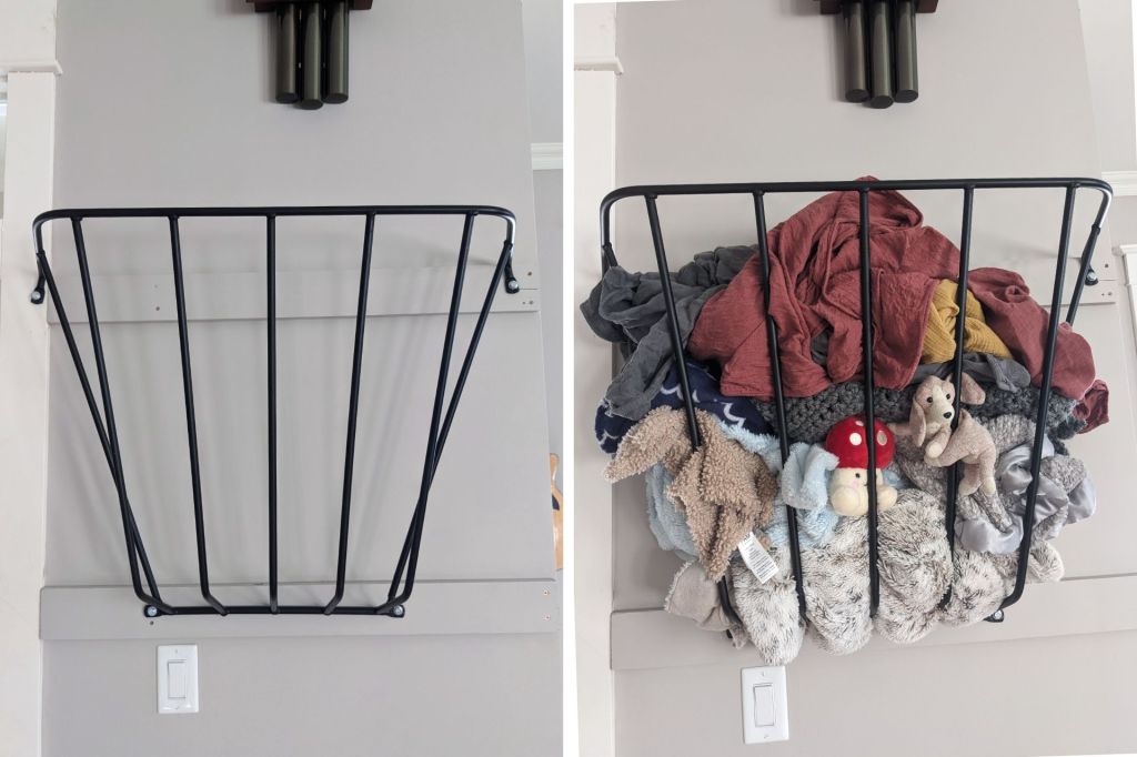 My game-changing solution? This genius wall-mounted basket that looks straight out of a farmhouse but actually started life as barn equipment (a hay feeder rack, if we’re being technical). I snagged it for under $100, gave it a quick clean, and mounted it right in our main living space.