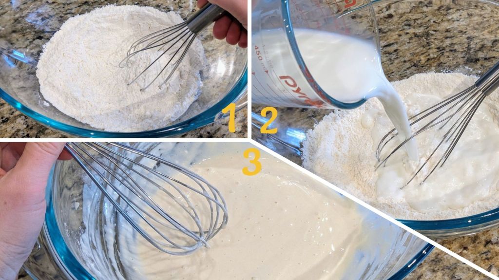 •Add the wet ingredients: Pour in the milk and water while whisking continuously.
